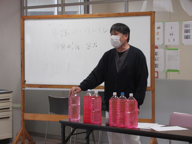 重さ体験では「こんなに重いんですか!」と驚かれたり、ペットボトルを使用した、血液量や尿・唾液についてのクイズでは