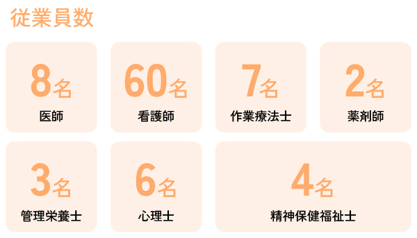 | 薬剤師/2名 | 管理栄養士/4名 | 作業療法士/14名 | 理学療法士/2名 |